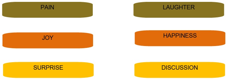 Examples: joy, sorrow, discussion, happiness.