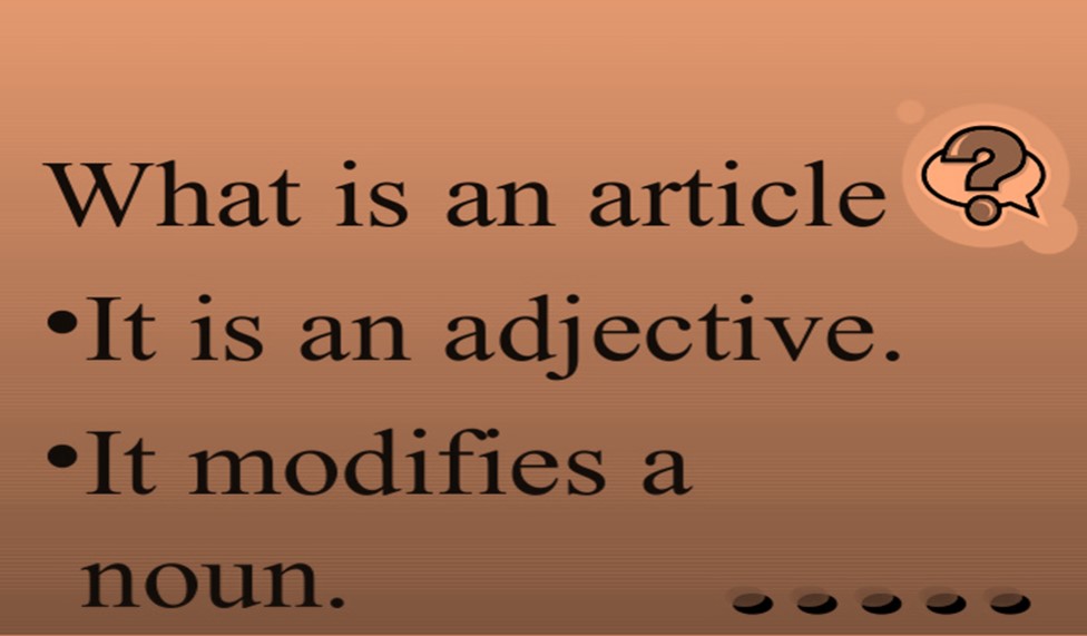 An article is a word used to modify a noun, which is a person, place, object, or idea. In other words, an article is an adjective, which is any word that modifies a noun. Usually adjectives modify nouns through description, but articles are used instead to point out or refer to nouns.