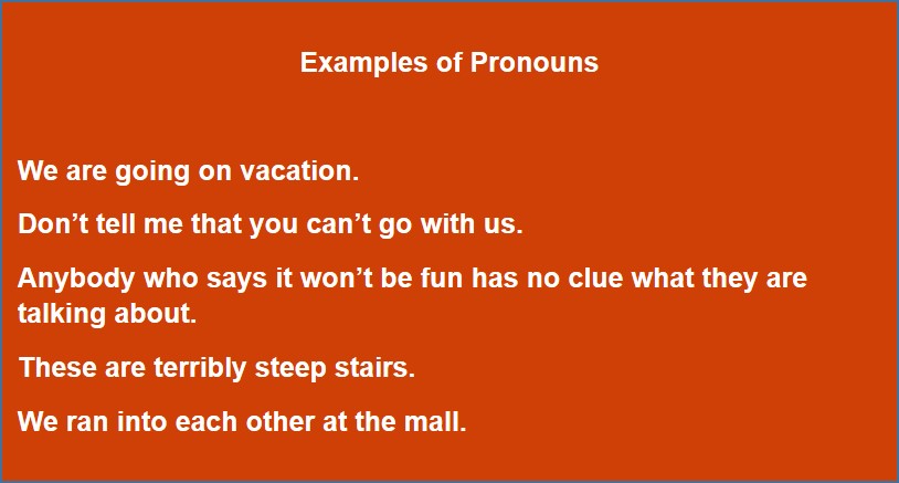 A pronoun is a word that replaces a noun in a sentence. Pronouns are used so that our language is not cumbersome with the same nouns being repeated over and over in a paragraph.