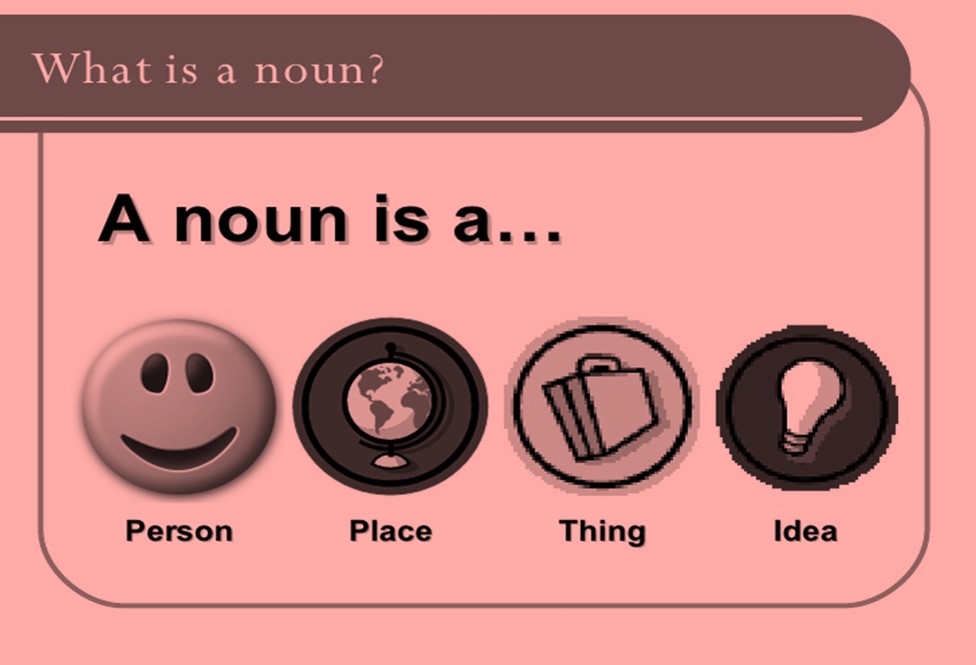 A noun is a word that identifies a person (name), animal, place, thing, or idea.