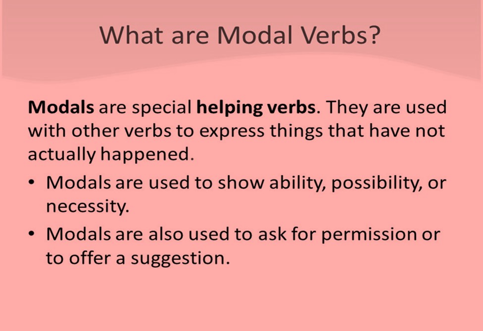 We use modal verbs to show if we believe something is certain, probable or possible. We also use modals to do things like talking about ability, asking permission making requests and offers, and so on. The modal verbs include can, must, may, might, will, would, should. They are used with other verbs to express ability, obligation, possibility, and so on.