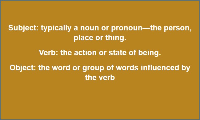 A sentence’s standard word order is Subject + Verb + Object (SVO). Remember, the subject is what a sentence is about; so, it comes first. For example: