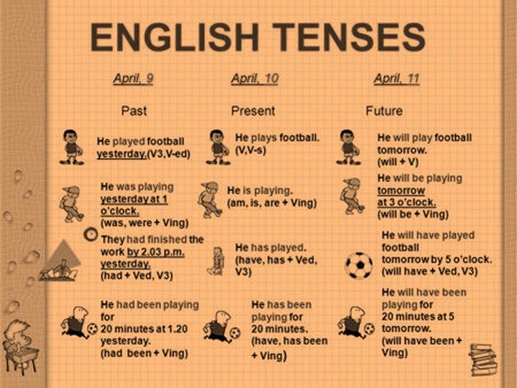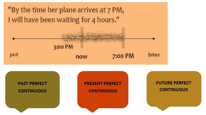 Present Continuous, Past Continuous, Future Continuous, Present Perfect, Past Perfect, Future Perfect, Present Perfect Continuous, Past Perfect Continuous and Future Perfect Continuous.